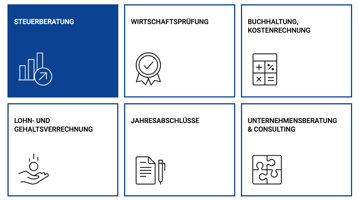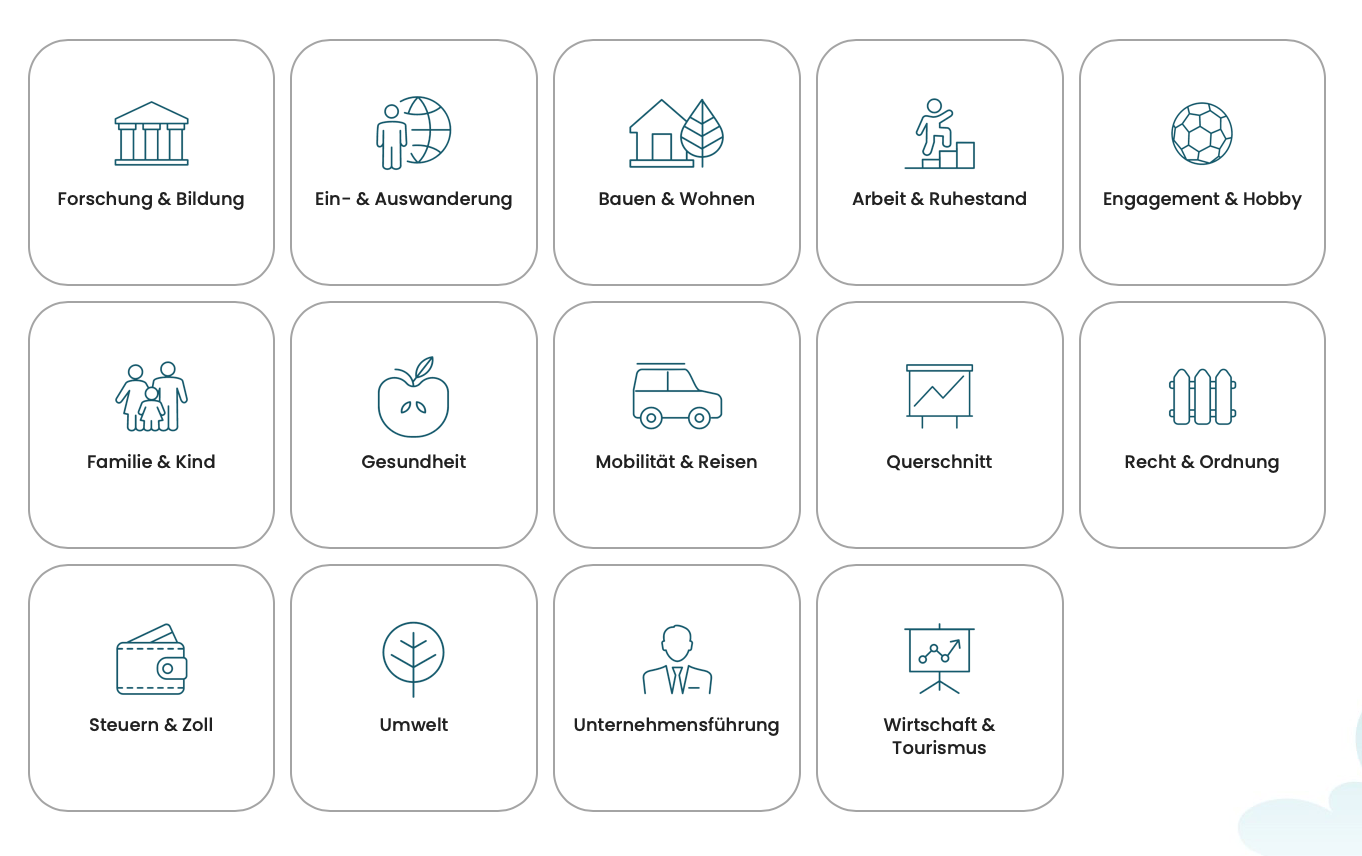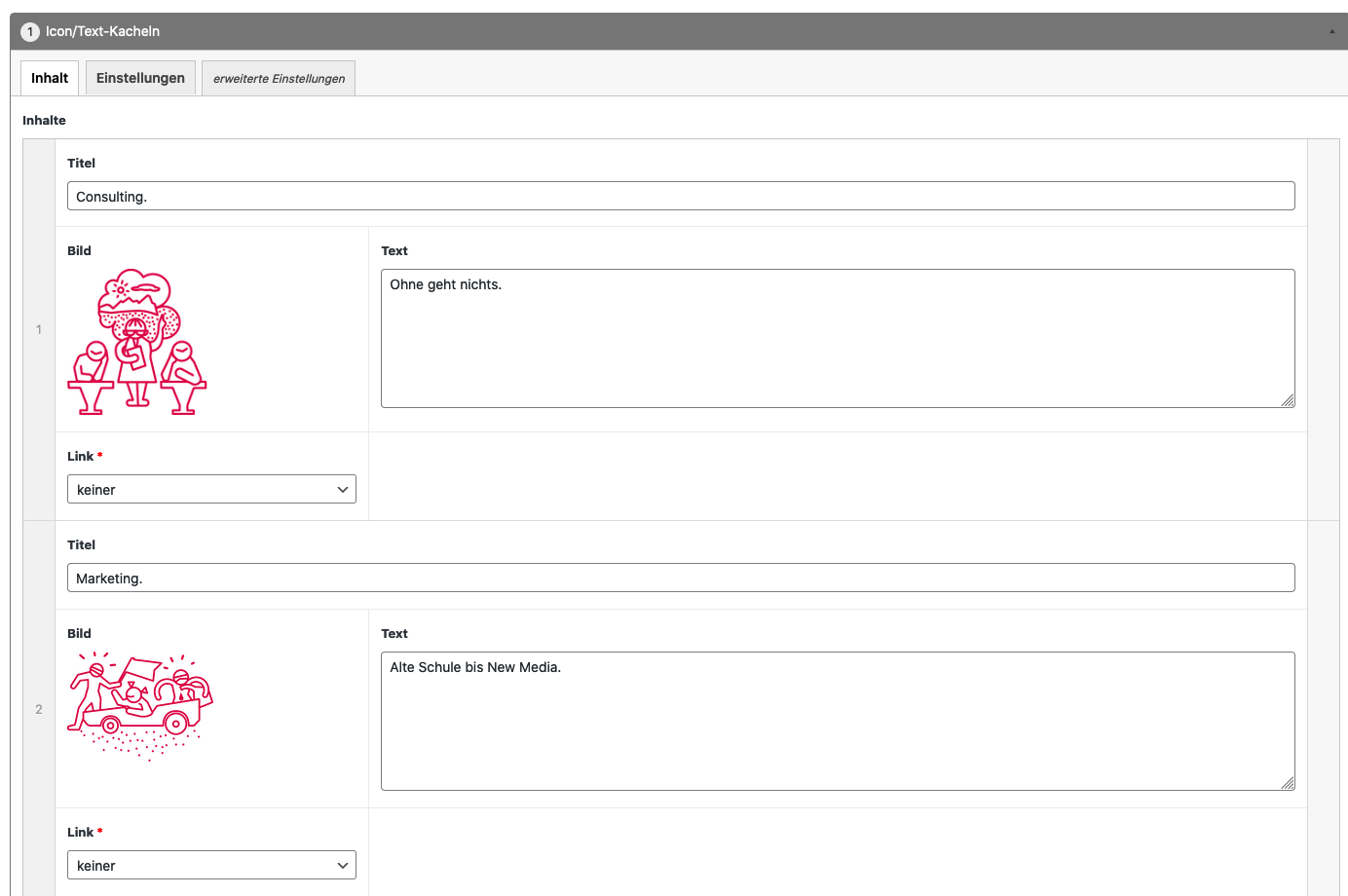 Dieser Block ermöglicht es einfach Kacheln mit Bildicons+Titel+Beschreibungstext zu erstellen und zu konfigurieren. Jede Kachel kann optional mit einem Link auf eine Subseite oder eine externe Web-Adresse versehen werden.
