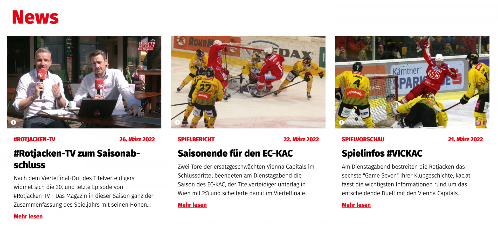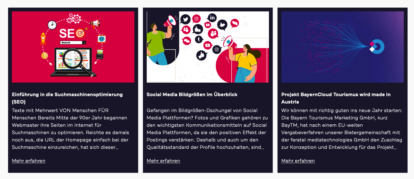 Dieser Block zeigt die aktuellsten News-Beiträge übersichtlich an (natürlich nur, wenn solche auf der Website existieren). Dabei können diese entweder in einem Raster (mit Bild links oder oberhalb des Beschreibungstextes) oder als Slider dargestellt werden.