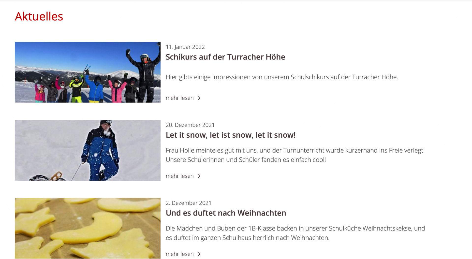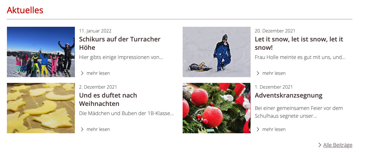 Aktuelles-Beiträge können über den Block „Aktuelle Beiträge“ in eine bestehende Website (oft auf der Startseite) eingebunden werden und/oder auf einer eigenen Archivseite angezeigt werden (Die Adresse kann je nach Website variieren).