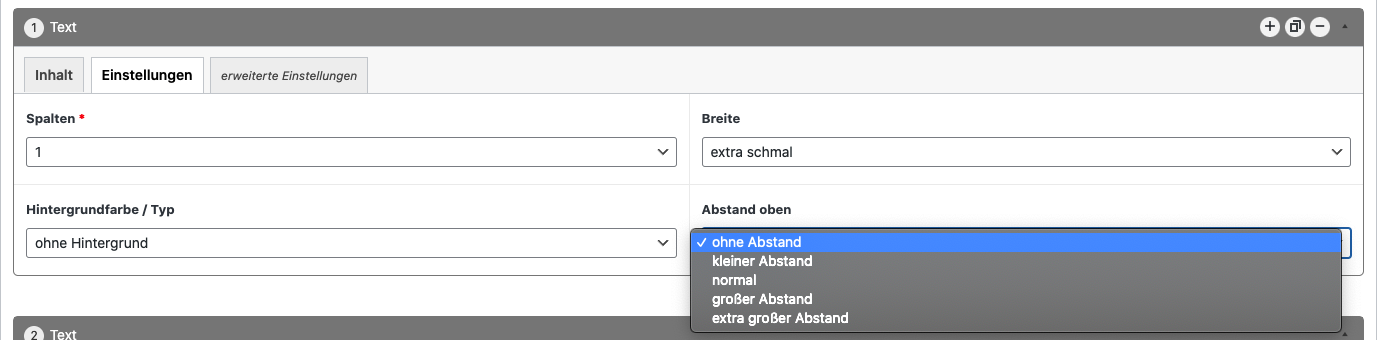 Die meisten Inhaltsblöcke bieten die Option, einen Abstand zum vorhergehenden (oberen) Inhaltsblock auszuwählen. Dabei wird bewusst mit abstrakten Größen klein/normal/groß/extra groß gearbeitet. Der tatsächliche Abstand richtet sich nach der Konfiguration der Website und dem Gerät, auf dem sie dargestellt wird (responsive Design).