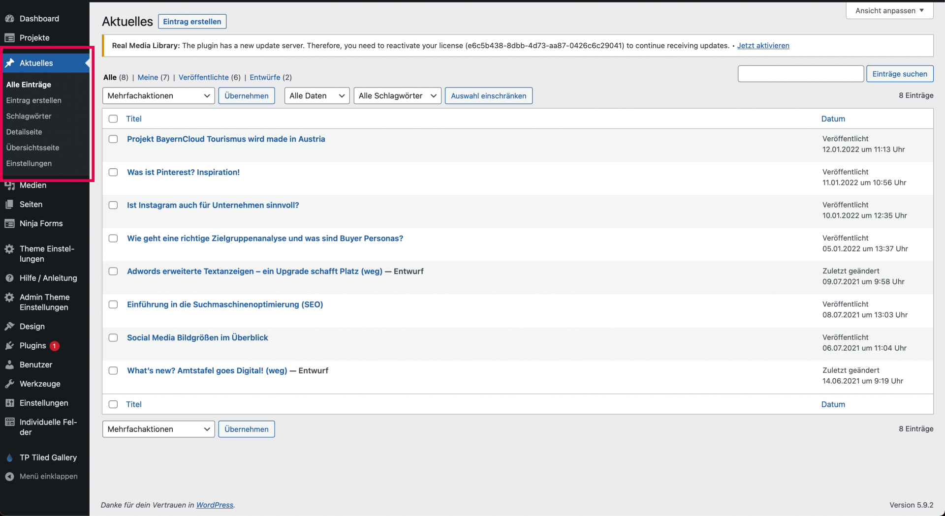 Die meisten Module sind im WordPress Backend in der Navigation auf der linken Seite eingetragen und können von dort aus bedient werden.