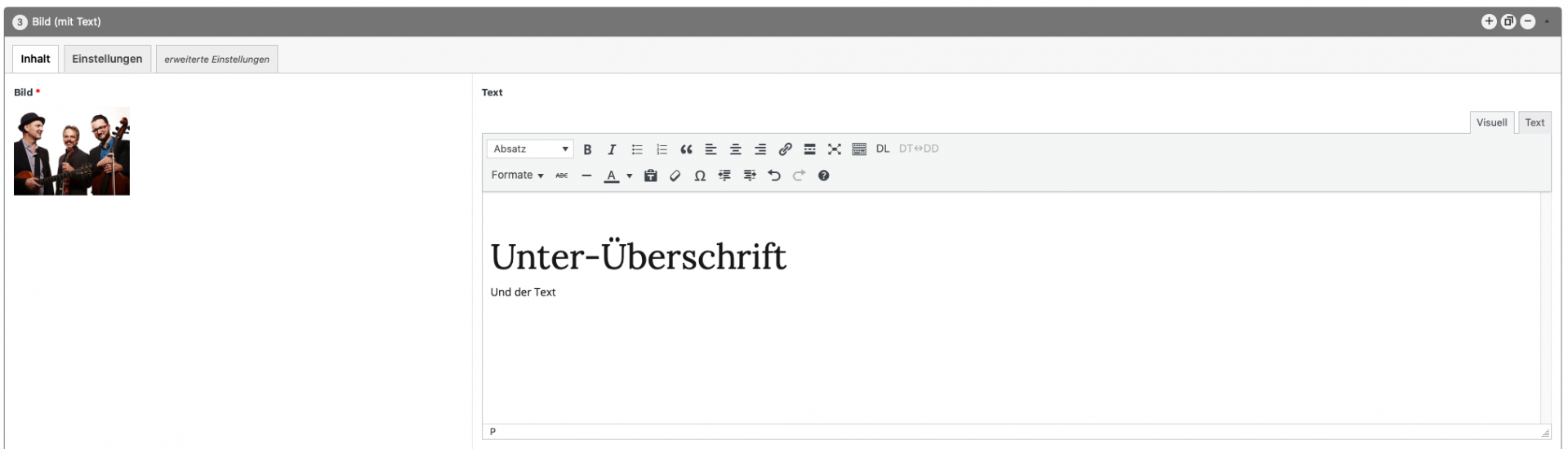 Der Inhalt besteht aus dem gewählten Bild und einem Texteditor, der in seiner Bedienung dem Text-Block entspricht.