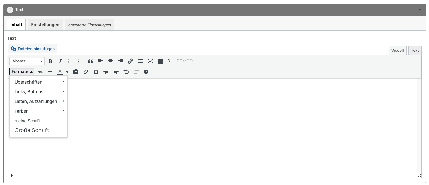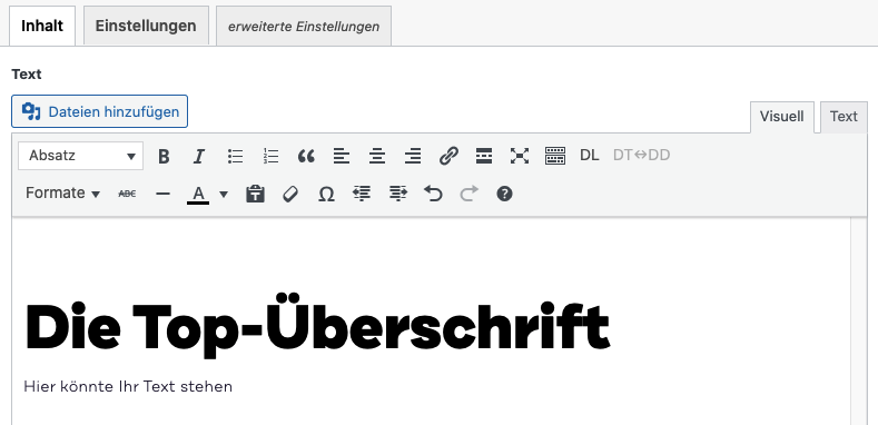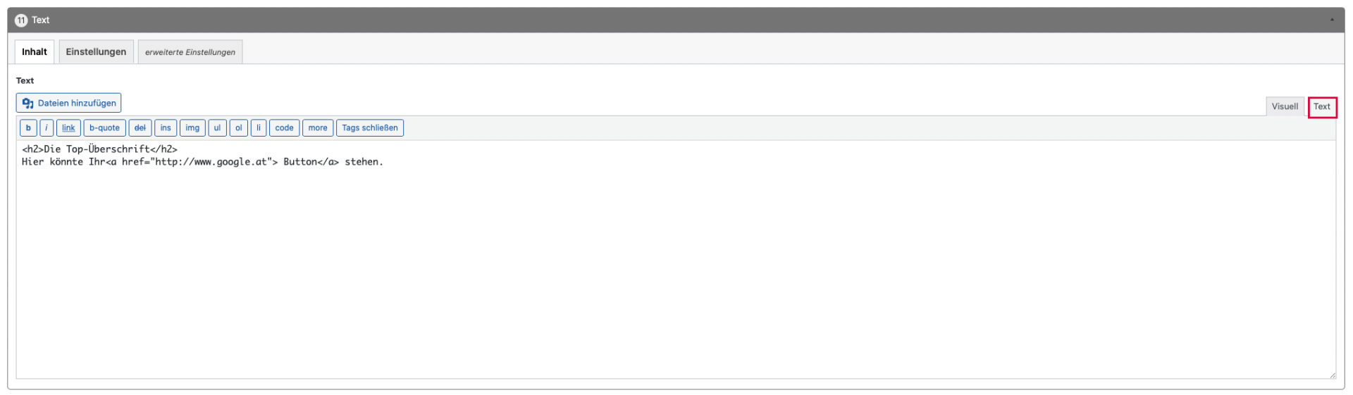 Über den Umschalter Visuell/Text rechts oben kann man sich den Textinhalt im HTML-Code ansehen und bearbeiten. Aber: Wer keine Erfahrung mit HTML-Code hat, sollte das vermeiden. Wenn man aber versehentlich in den Text-Modus gelangt, kommt man ganz einfach mit einem Klick auf „Visuell“ wieder zurück.