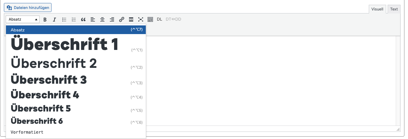 Anders als bei der „normalen“ Gestaltung von Texten wie z.B. in Word, ist es wichtig, auf Websites die sogenannte Überschriften-Hierarchie einzuhalten – darum sind die Formatierungen auch dementsprechend vorgegeben (Überschrift 1, 2 etc.). Diese Hierarchie sind wichtig für Suchmaschinen (z.B. Google) und damit auch für das Ranking einer Website sowie für das barrierefreie Bedienen einer Website.