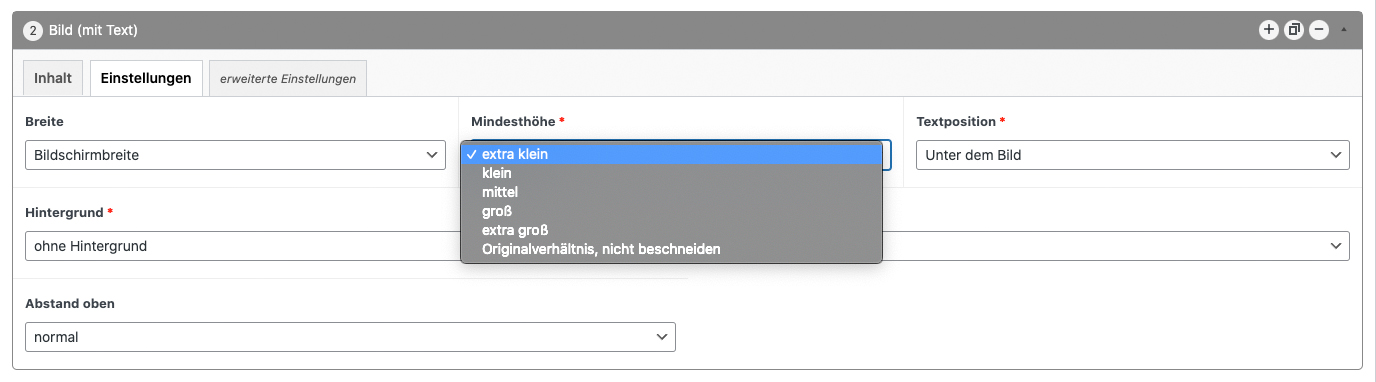 - Die Mindesthöhe gibt an, wie das Bild beschnitten wird: Größen von extra klein bis extra groß oder im Originalverhältnis erhalten stehen zur Verfügung.