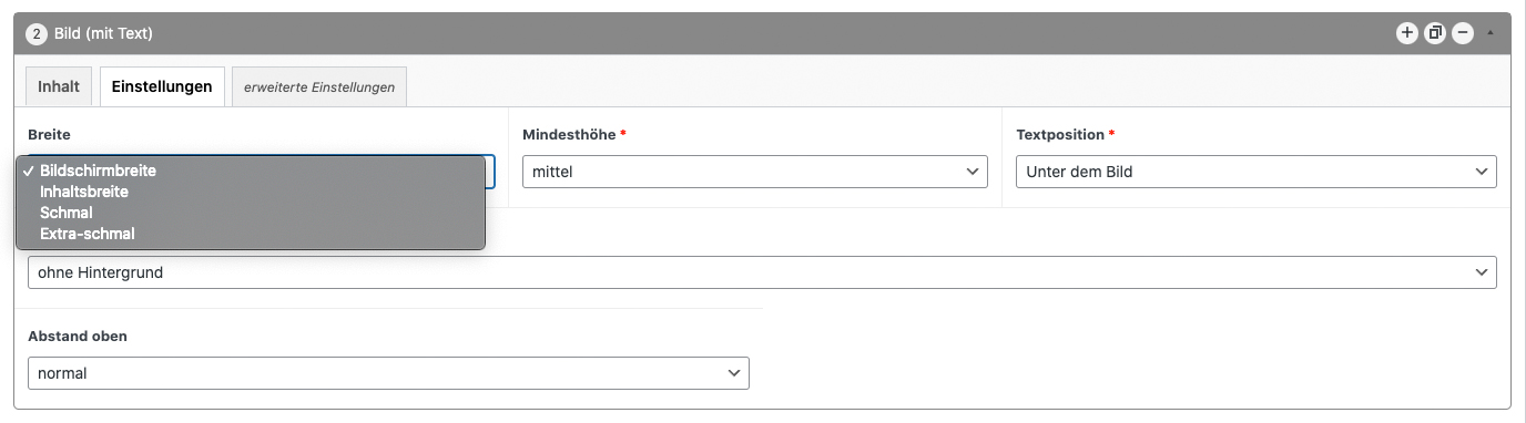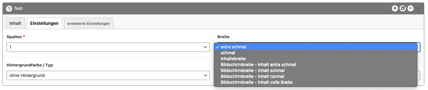 Viele Elemente bieten auch die Möglichkeit Bildschirmbreite – Inhalt normal/schmal/extra-schmal.