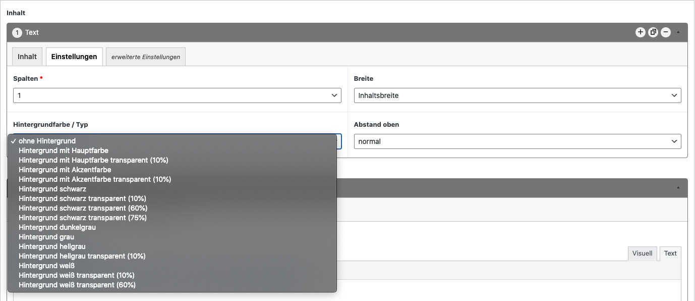 Die meisten Inhaltsblöcke bieten die Option, eine Hintergrundfarbe zu wählen. Die Farben werden aber auch an anderen Stellen verwendet.
