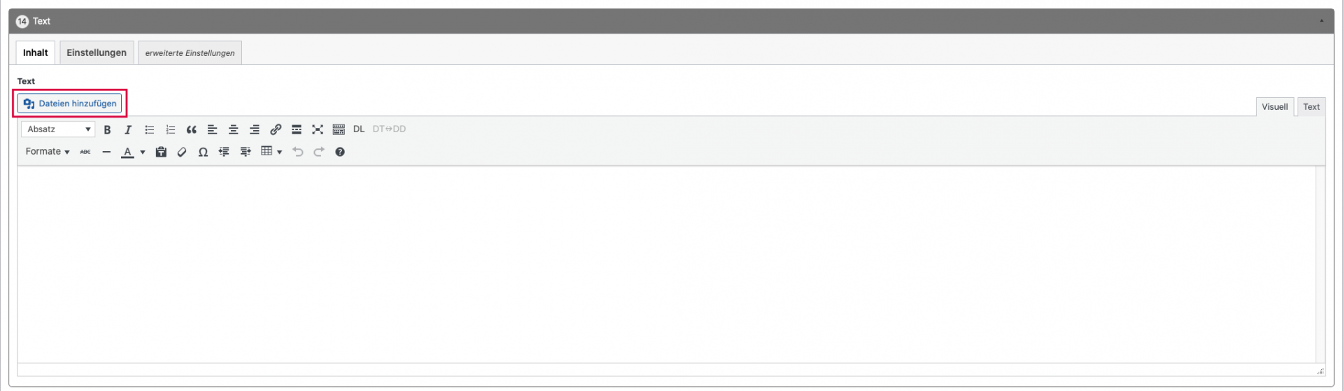 Über „Dateien einfügen“ links oben kann im Texteditor ein Bild eingefügt werden.