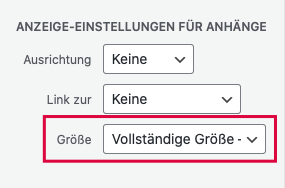 Dabei ist wichtig, das Bild nur in einer notwendigen Größe auszuwählen (rechts unten im „Medien einfügen“-Dialog“):