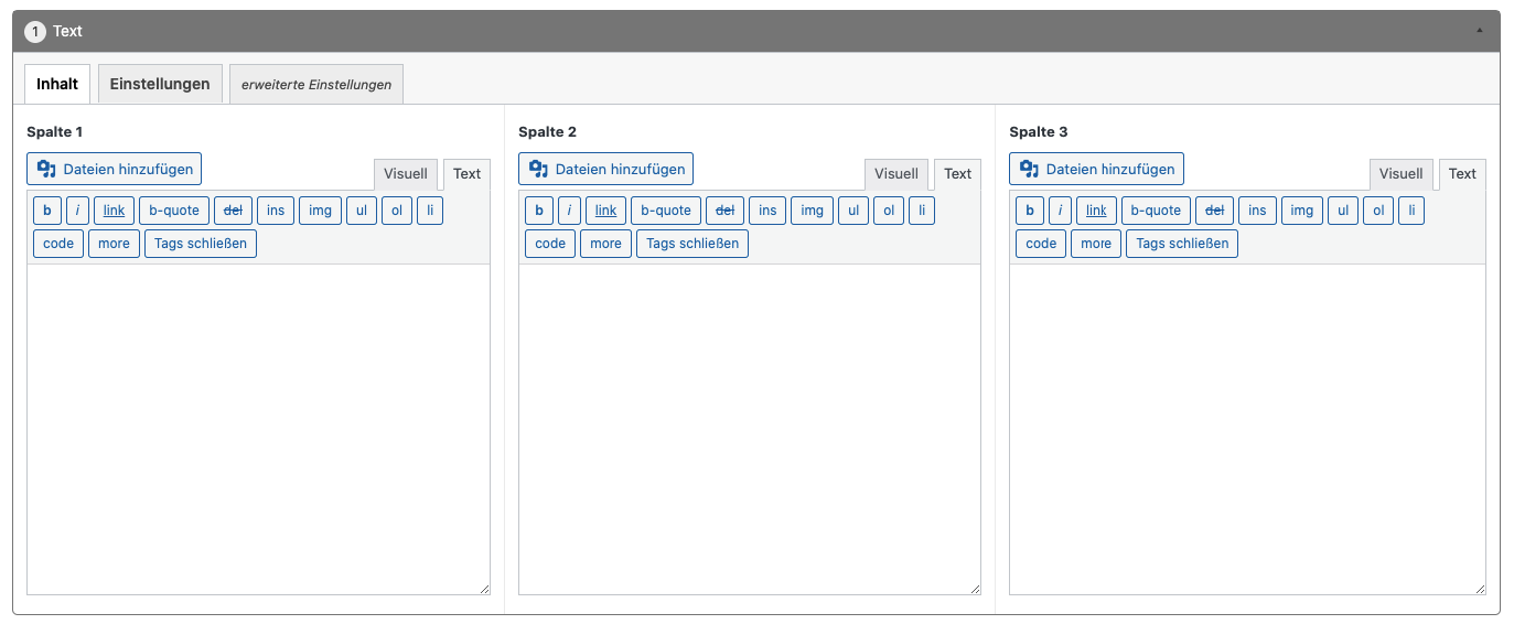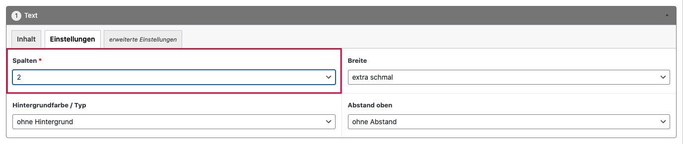 Neben den allgemeinen Einstellungen gibt es bei den Einstellungen des Textblocks die Option, den Block mehrspaltig zu gestalten: bis zu vier Textblöcke können nebeneinander in Spalten angeordnet werden: