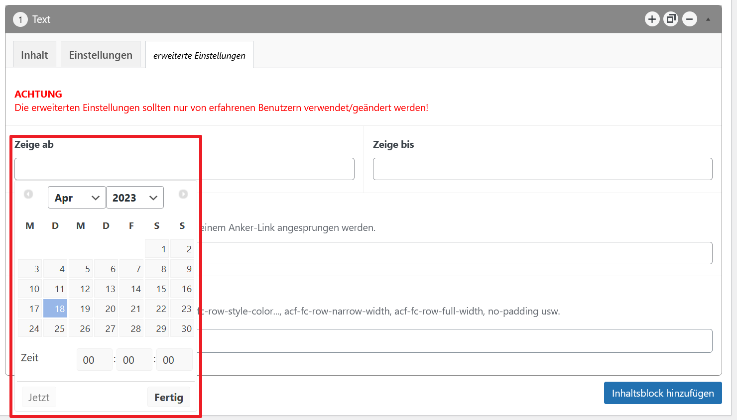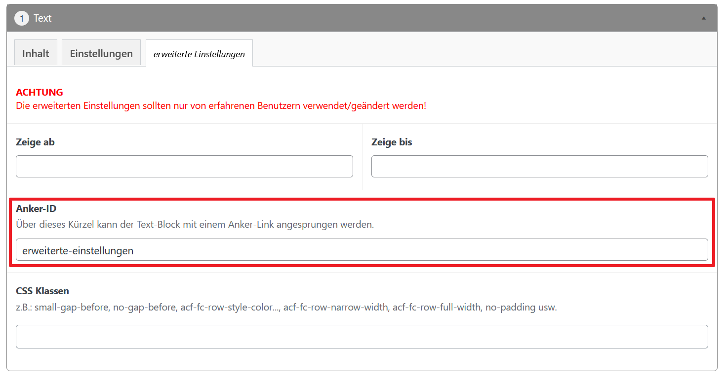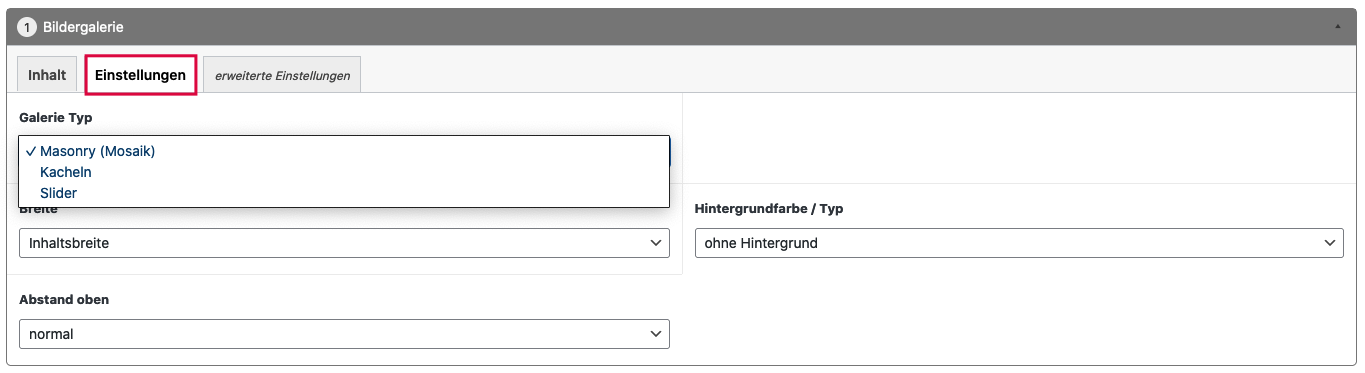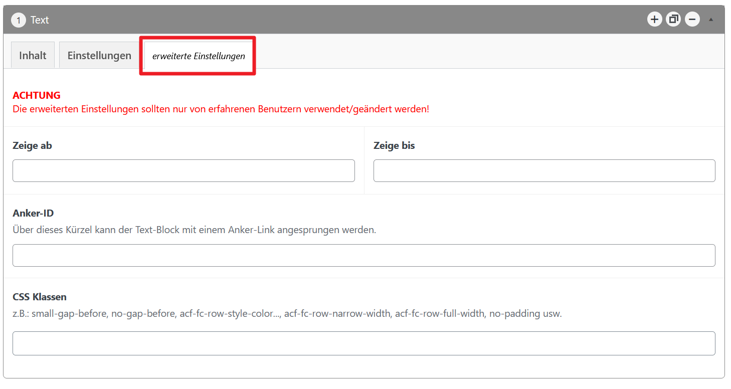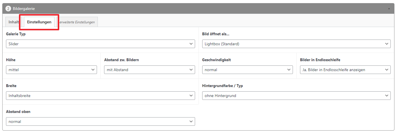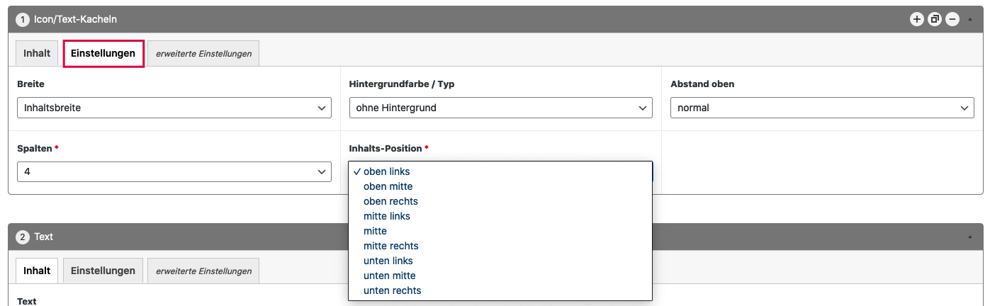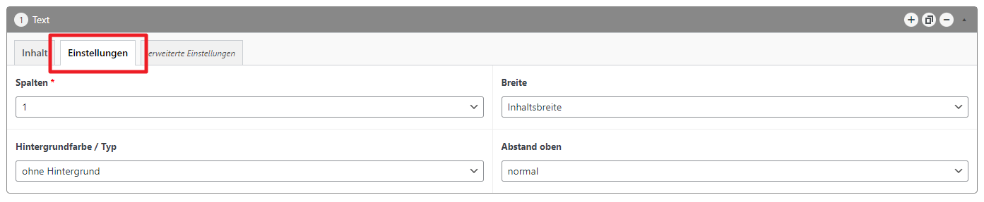 Diese Einstellungen finden sich im Inhaltseditor bei den jeweiligen Inhaltsblöcken im Tab „Einstellungen“ und definieren die erweiterte Einstellungendes Inhaltsblocks auf der Website.