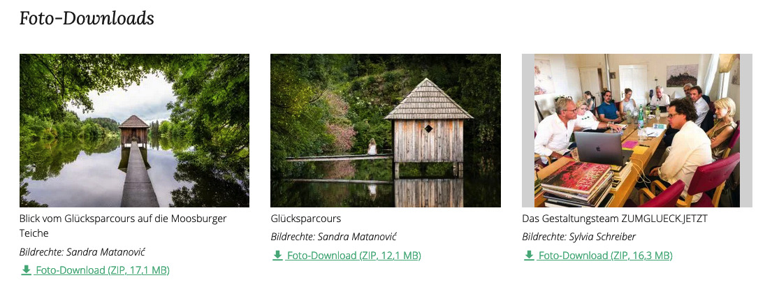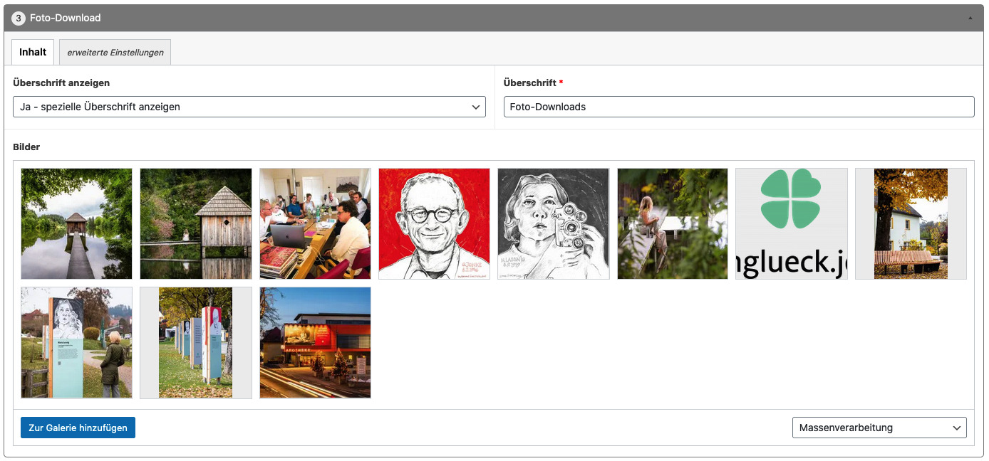 Eine Kombination aus Galerie und Download ist der Block Foto-Download. Hier werden die Bilder gleich zusammen mit einem Link dargestellt, mit dem das Bild/die Bilder als ZIP in Originalgröße heruntergeladen werden kann.