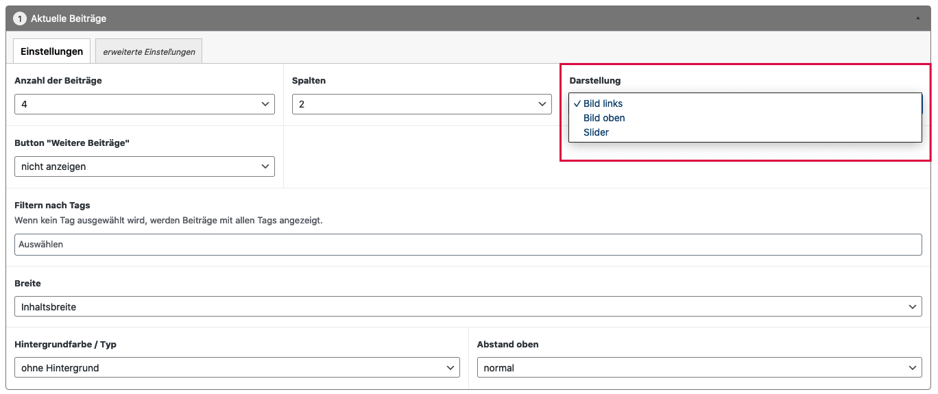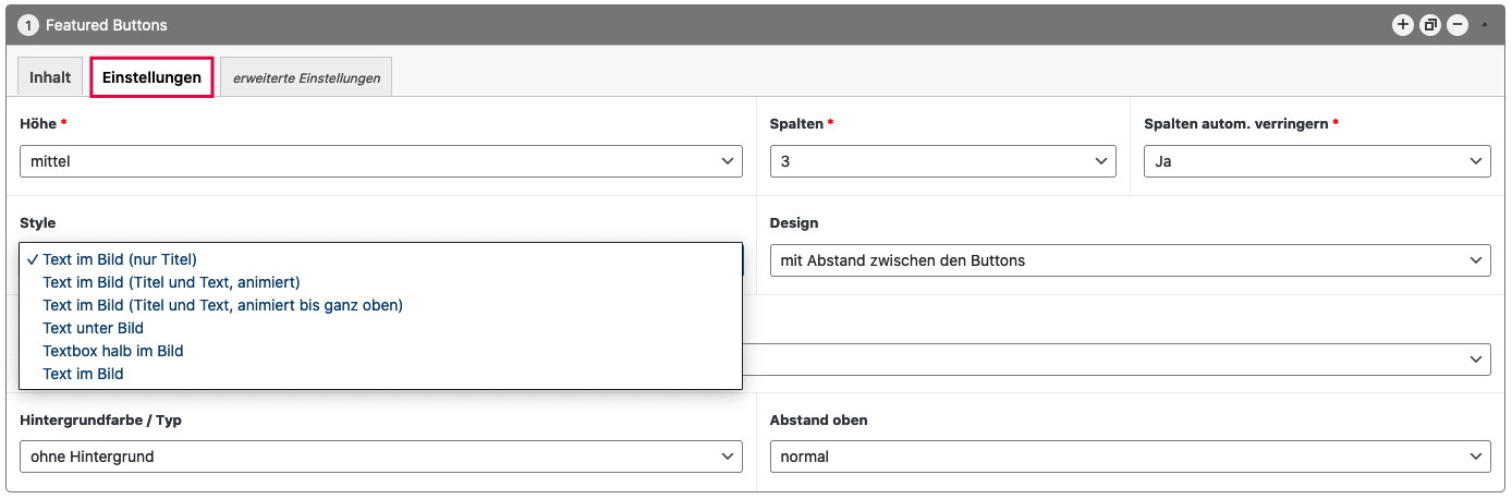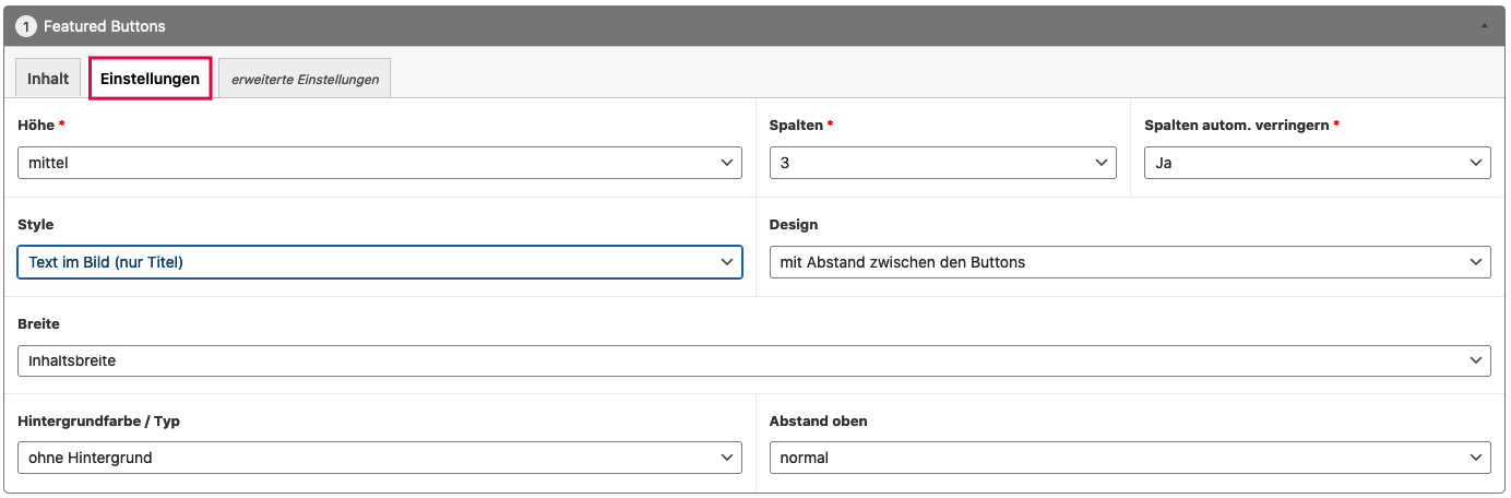 Diese Einstellungen finden sich im Inhaltseditor bei den jeweiligen Inhaltsblöcken im Tab „Einstellungen“ und definieren die allgemeine Darstellung des Inhaltsblocks auf der Website. Meist gibt es für den jeweiligen Inhaltsblock noch zusätzliche Einstellungen wie die Anzahl der Spalten, eine Mindesthöhe usw.