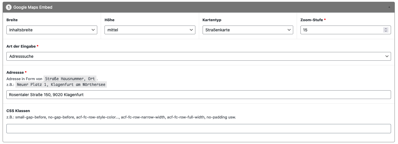 Die Position des Pins kann als Adresse oder als Koordinaten eingegeben werden. Zus. können Darstellungsform (Straßenkarte, Satellitenbild, Hybrid, Gelände) und die initiale Zoomstufe gewählt werden.