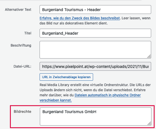 Wenn die Bildrechte-Einstellungen für die Website aktiviert sind, können auch diese hinterlegt werden. Sie werden dann auf der Website beim Bild automatisiert angezeigt und sorgen damit für Rechtssicherheit.