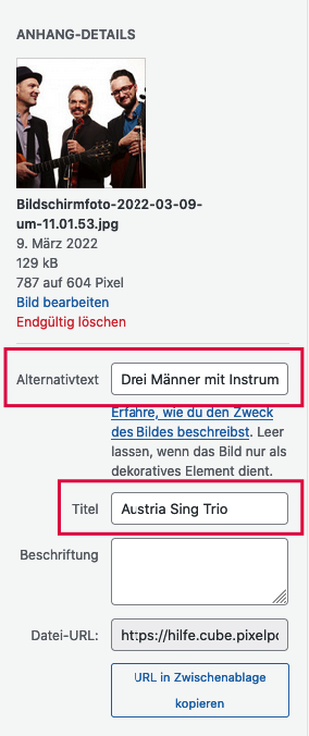 Wenn ein Bild ausgewählt wird, entweder aus der Mediathek oder nachdem es gerade hochgeladen wurde, werden auf der rechten Seite die Eigenschaften des Bildes angezeigt und können auf Wunsch ergänzt werden. Zumindest ein verständlicher Titel sollte immer eingegeben werden.