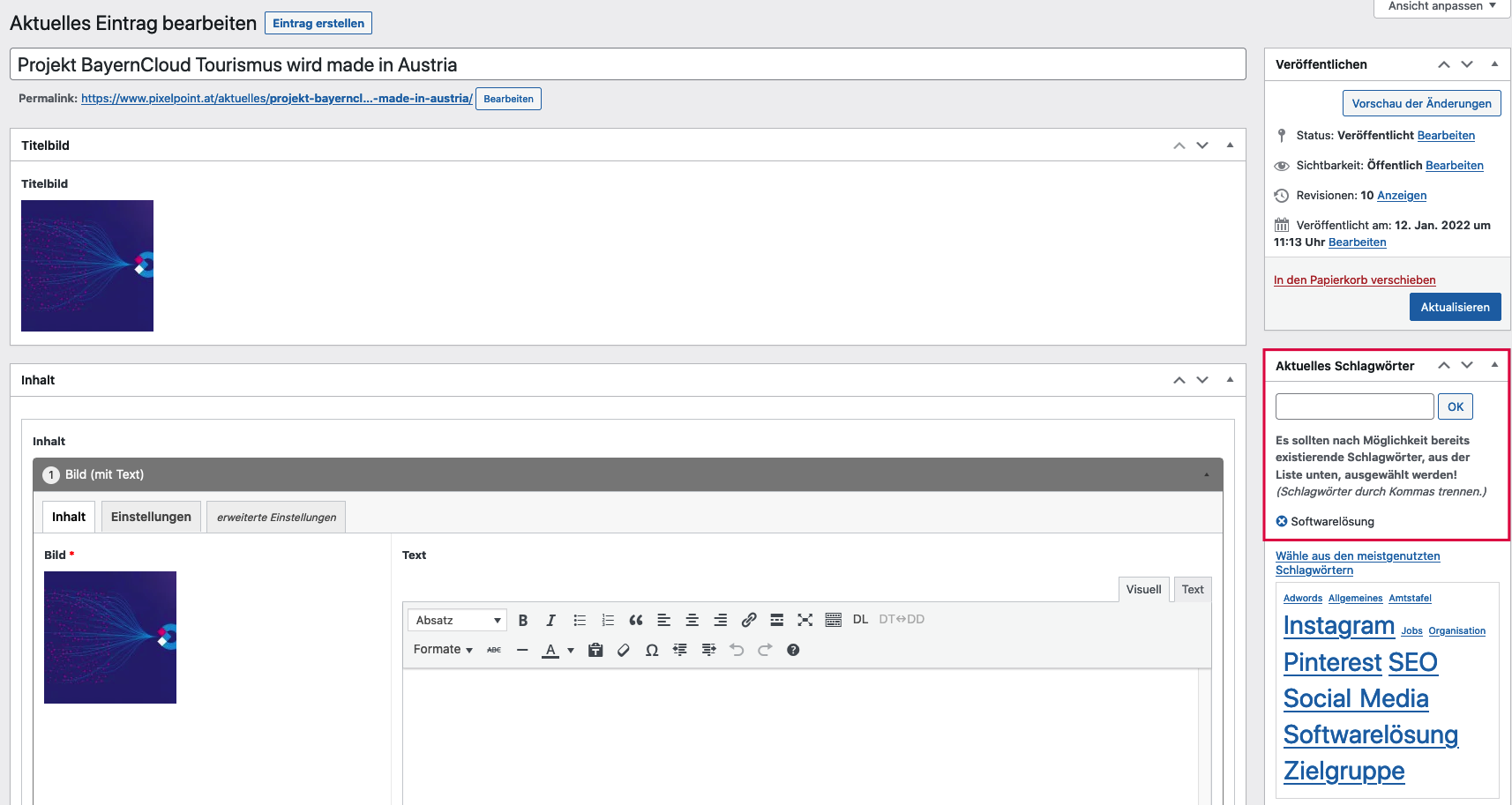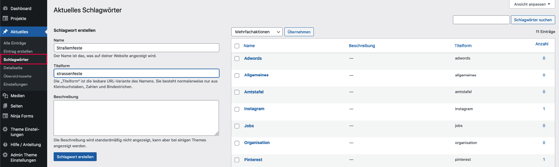 Unter „Schlagwörter“ können Kategorien erstellt werden, die bei den Aktuelles-Beiträgen ausgewählt werden können und der Filterung dienen.