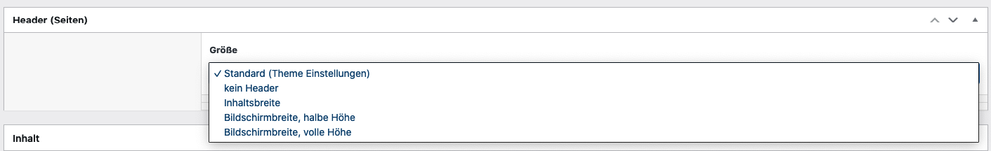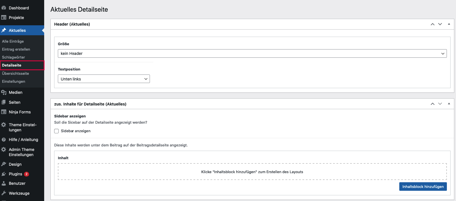 Unter „Detailseite“ wird definiert, ob ein allgemeiner Text auf der Detailseite jedes Beitrags angezeigt werden soll und entschieden, wie groß das Header-Bild dargestellt wird und ob eine Seitenleiste angezeigt werden soll.