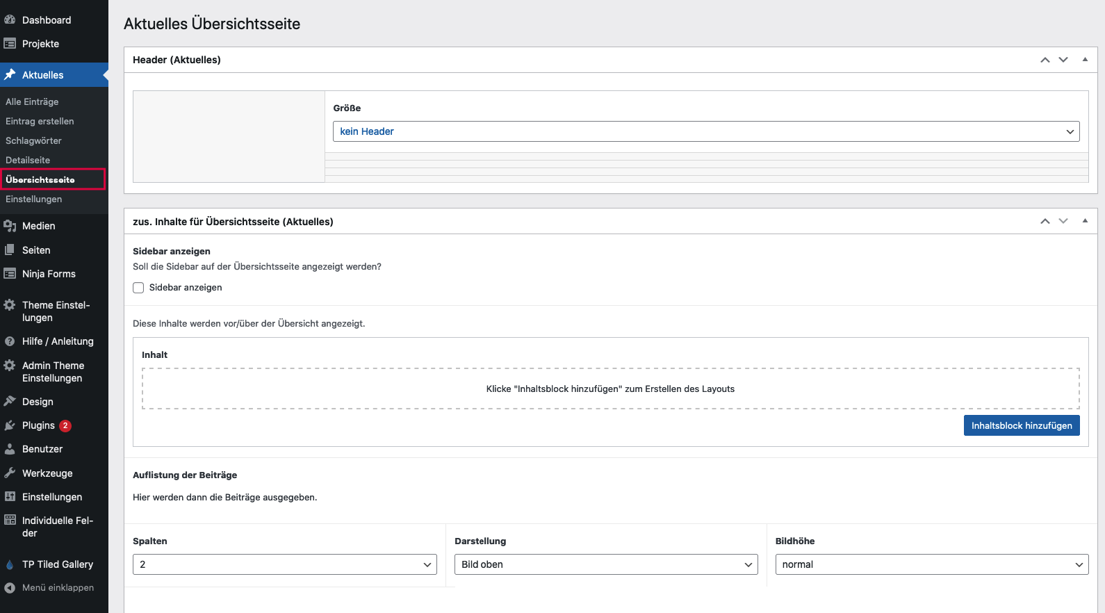 Unter „Übersichtsseite“ wird definiert, wie eine etwaige Archiv-Seite der Beiträge aussehen soll.