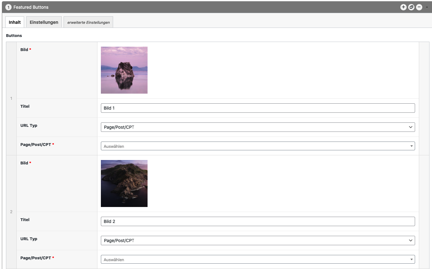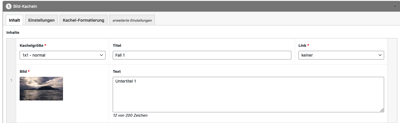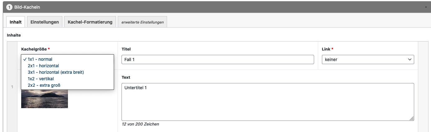 Wenn die Optionen der Icon/Text-Kacheln oder der Featured Buttons nicht ausreichen, ermöglicht dieser umfangreich konfigurierbare Block die Erstellung von individuellen Bild-Kachel-Elementen. Der Block erfordert aber etwas mehr Einarbeitung. Jede Kachel im Block besteht aus einem Bild und optional einem Titel und/oder Text.