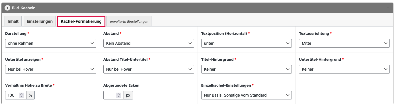 - Textposition (horizontal) und Textausrichtung: Geben die Positionierung von Titel+Text innerhalb der Bildkachel an.