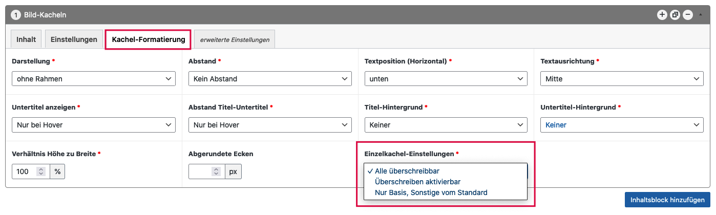 Wird „überschreibbar“ aktiviert, kann jede Kachel im Inhalt unterschiedlich formatiert werden (Was nur in Ausnahmefällen Sinn macht!).