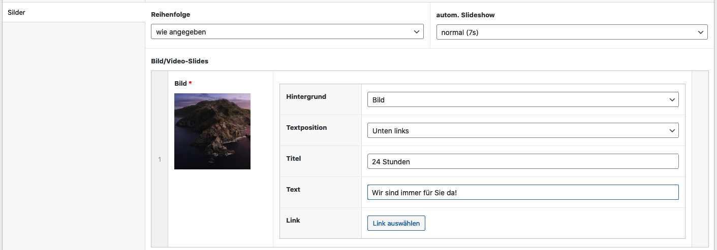 Bei den einzelnen Slider-Elementen kann links ein Bild oder Video gewählt werden (bei einem Video muss „Hintergrund“ rechts auf „Video“ umgestellt werden.
