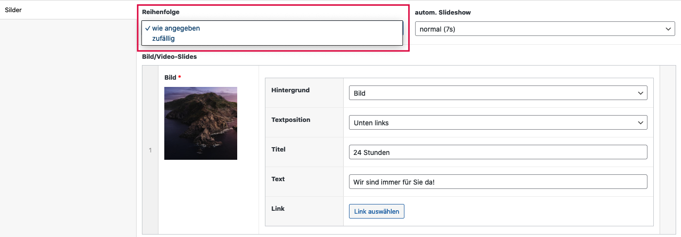 Bei einem Bild- und Video-Slider kann ausgewählt werden, ob Elemente in der Reihenfolge dargestellt werden sollen, in der sie (siehe weiter unten) angegeben oder jedes Mal neu und zufällig gemischt werden. Außerdem kann die Wechselgeschwindigkeit angegeben werden: