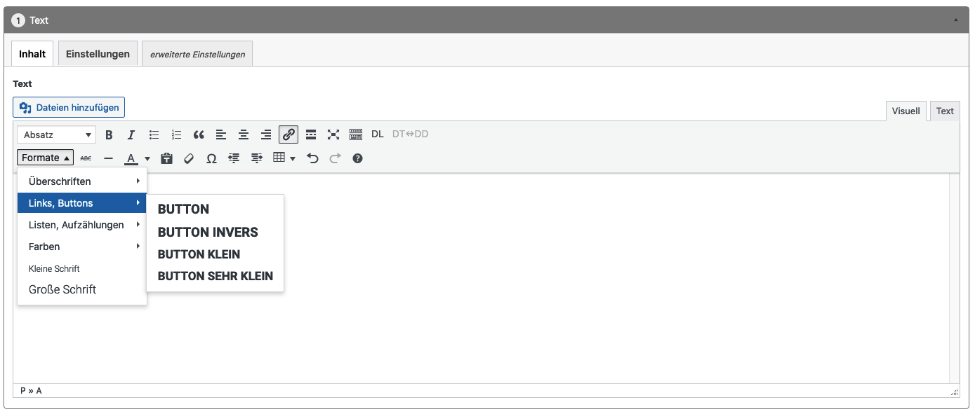 Wenn ein Text verlinkt wird, kann man ihn auch als Button erscheinen lassen, indem man aus den Formaten unter dem Punkt Links, Buttons auswählt. Das ist wichtig, um einerseits Dinge hervorzuheben als auch, damit Links für die User klar als solche erkennbar sind – man unterstützt damit die Bedienbarkeit einer Website.