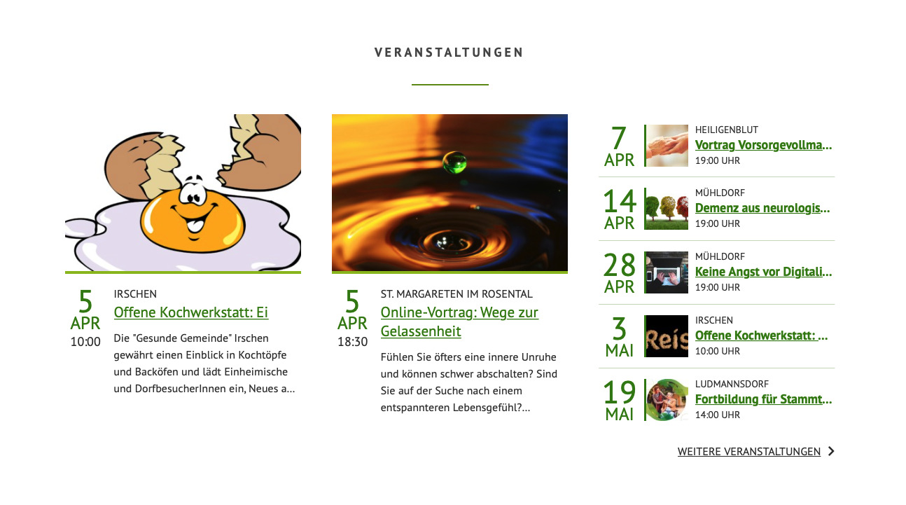 Veranstaltungen sind vergleichbar mit den Aktuelles-Beiträgen ein eigener Beitragstyp, mit Archivseite, Detailseiten und der Möglichkeit, mit dem „Veranstaltungen“-Block in eine Seite integriert zu werden.
