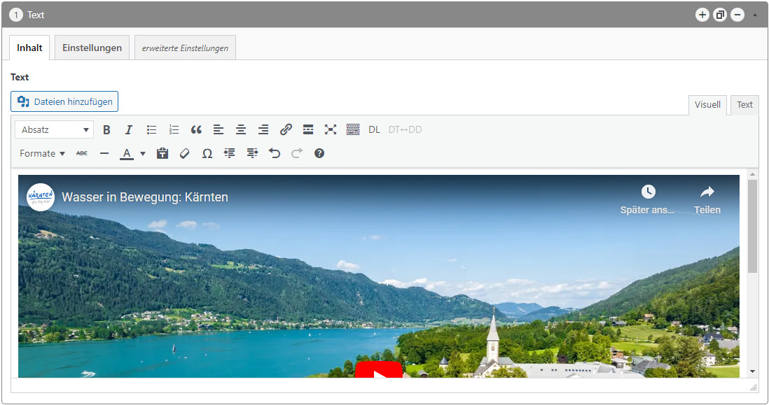 Dazu einfach die URL des Videos in einen Text-Inhaltsblock per Copy & Paste einfügen. Das Video erscheint dann automatisch im Textblock.