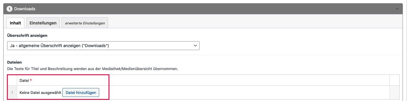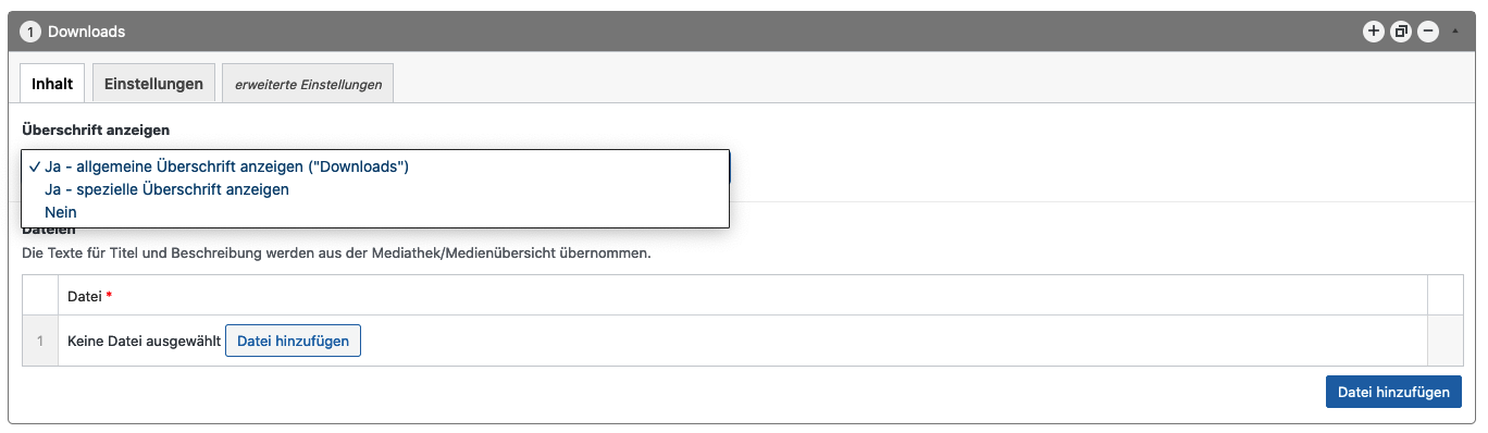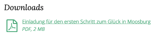 Der Block „Downloads“ bietet die Möglichkeit, Dokumente wie z.B. Flyer-pdfs sauber formatiert zum Download anzubieten.