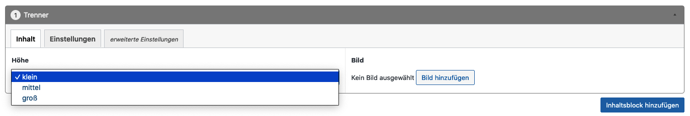Dieser Block kann größere Abstände zwischen Imhlatsblöcken schaffen, wenn selbst der „extra große“ Abstand in den Block-Einstellungen nicht mehr ausreicht oder wenn eine Trennergrafik verwendet werden soll. Er sollte auch nur dann verwendet werden!
