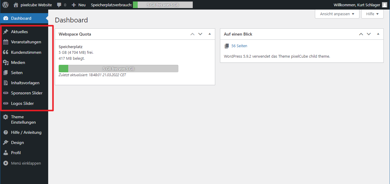 Die meisten Module sind im WordPress Backend in der Navigation auf der linken Seite eingetragen und können von dort aus bedient werden.