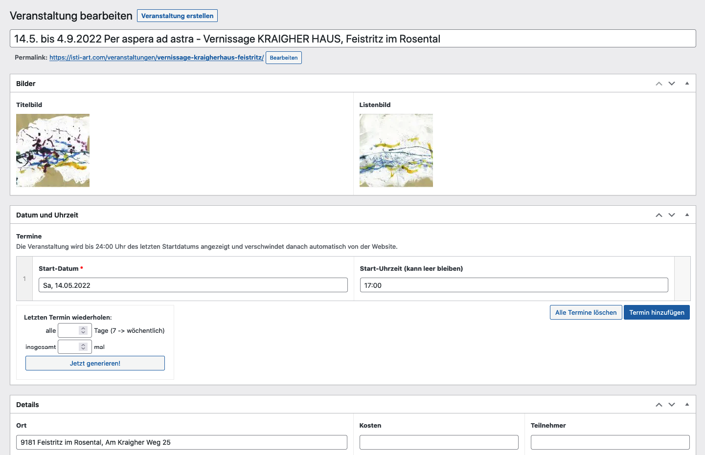 Darüber hinaus wird ein Titelbild für die Detail- und Listenansicht, ein Beschreibungstext und optional ein Veranstalter und Veranstaltungsort definiert.