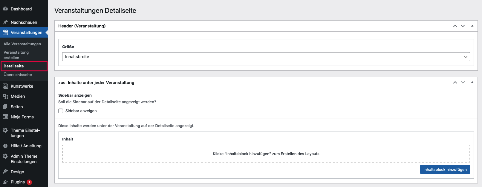 Wie bei Aktuelles können auch bei den Veranstaltungen die einleitenden Texte für die Archiv- und Detailseiten definiert werden und gewählt werden, ob eine Seitenleiste angezeigt werden soll oder nicht.