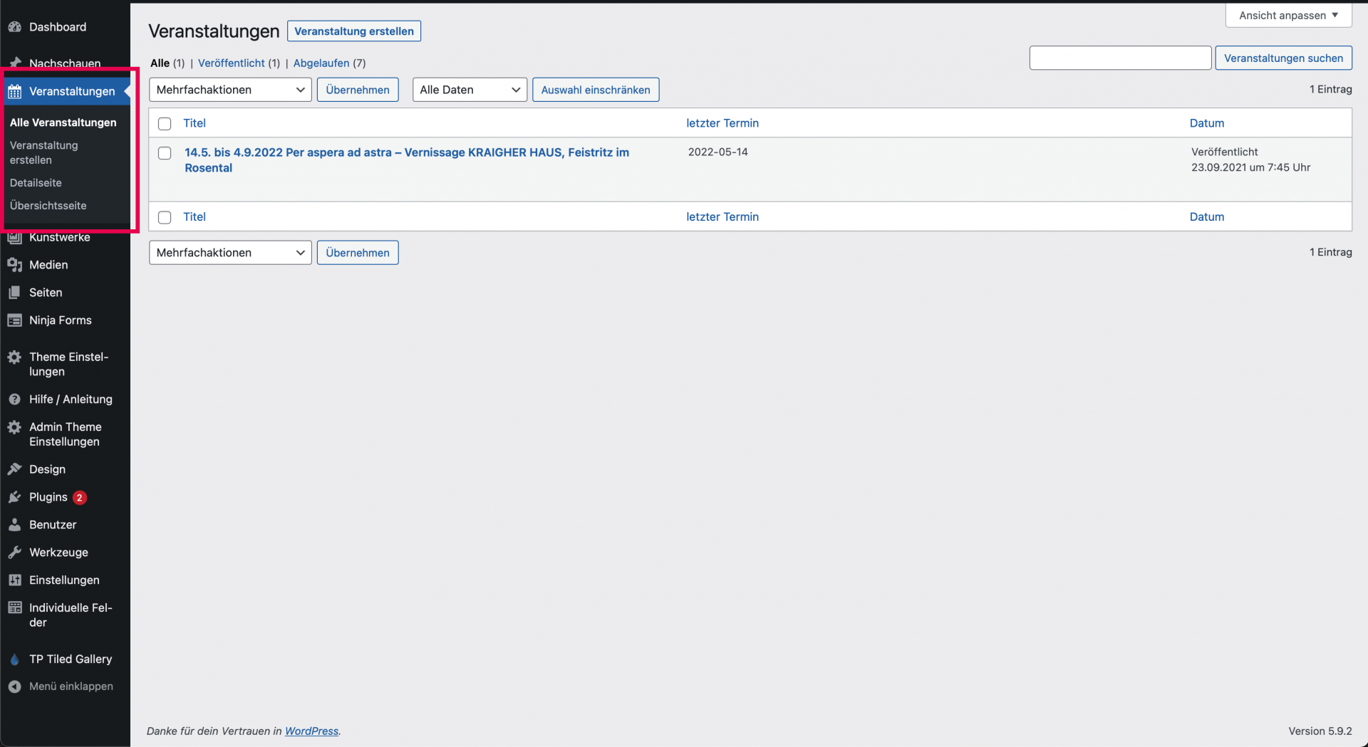 Veranstaltungen sind vergleichbar mit den Aktuelles-Beiträgen ein eigener Beitragstyp, mit Archivseite, Detailseiten und der Möglichkeit, mit dem „Veranstaltungen“-Block in eine Seite integriert zu werden.